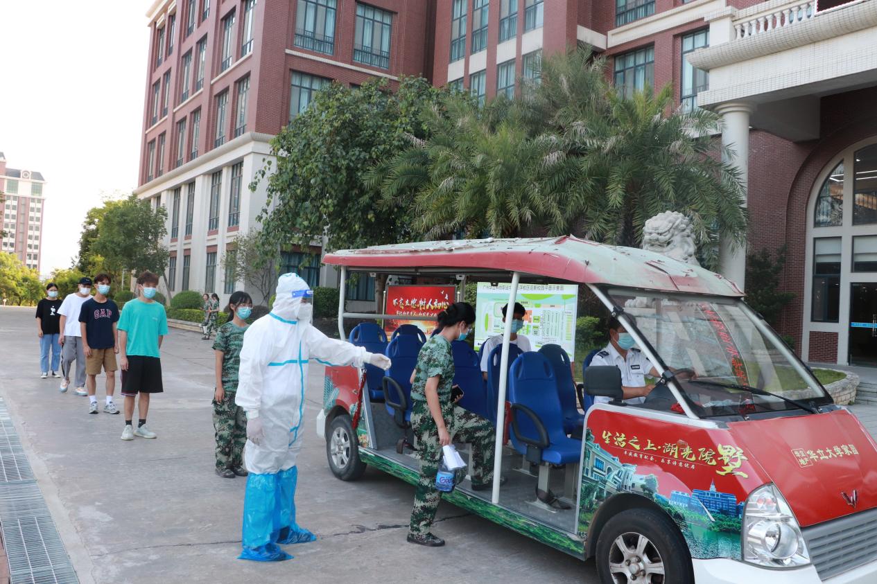 市轉(zhuǎn)移隔離專(zhuān)班安排的轉(zhuǎn)運(yùn)車(chē)輛到達(dá)學(xué)校,準(zhǔn)備分批轉(zhuǎn)移密接者、次密接者和重點(diǎn)人員至隔離酒店。師生登車(chē)前,醫(yī)護(hù)人員給師生測(cè)體溫、指導(dǎo)戴好口罩(糾正不正確的佩戴方式)、詢問(wèn)癥狀。學(xué)校核對(duì)全部待轉(zhuǎn)運(yùn)人員信息確定無(wú)誤后,各引導(dǎo)員引導(dǎo)學(xué)生有序上車(chē),并按規(guī)定座位間隔坐好。隨車(chē)醫(yī)生提醒師生要全程佩戴口罩不要摘下,避免交談,不要串座。校方委派志愿者隨車(chē)前往隔離酒店,協(xié)同酒店管理隔離的師生。