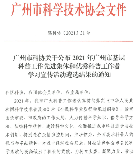 此次評選是廣州市在各區(qū)、街(鎮(zhèn))、社區(qū)(行政村)、學(xué)會(協(xié)會、研究會)、企事業(yè)科協(xié)(含高??茀f(xié))及市科協(xié)直屬單位專兼職科普工作者,科普專家,科普志愿者,農(nóng)村科普帶頭人中評選的,在科普領(lǐng)域做出突出貢獻(xiàn)的科技人才。共評選出優(yōu)秀科普工作者50名,其中企事業(yè)科協(xié)(含高??茀f(xié))限額10名,我校與華南師范大學(xué)、廣州大學(xué)地理科學(xué)與遙感學(xué)院、仲愷農(nóng)業(yè)工程學(xué)院、廣州科技貿(mào)易職業(yè)學(xué)院和廣州南洋理工職業(yè)學(xué)院的科普專家同獲殊榮。