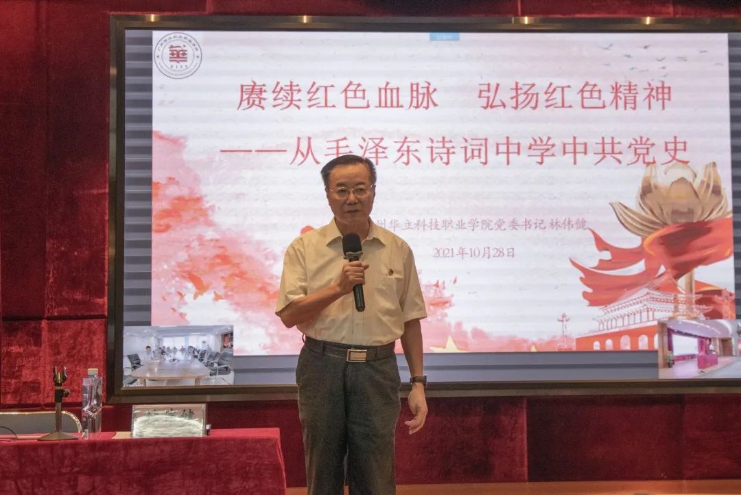 10月28日下午,廣州華立科技職業(yè)學(xué)院黨委書記林偉健教授在東區(qū)1號(hào)報(bào)告廳講授“思政第一課”,解讀毛主席詩詞,領(lǐng)悟由建黨精神構(gòu)建的中國共產(chǎn)黨人的精神譜系及詩詞中蘊(yùn)含的紅色精神,要求華立學(xué)子秉承革命先輩遺志, 弘揚(yáng)紅色精神,踐行初心使命,樹立為黨為國為民永久奮斗、赤誠奉獻(xiàn)的堅(jiān)定理想。學(xué)校全體黨務(wù)干部、思政教師、入黨積極分子和學(xué)生參加學(xué)習(xí),云浮校區(qū)師生在線上參加會(huì)議。省教育工委黨史學(xué)習(xí)教育第七巡回指導(dǎo)組成員以視頻方式參會(huì)指導(dǎo)。