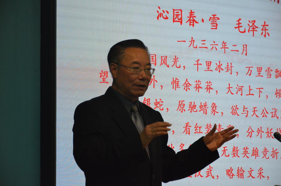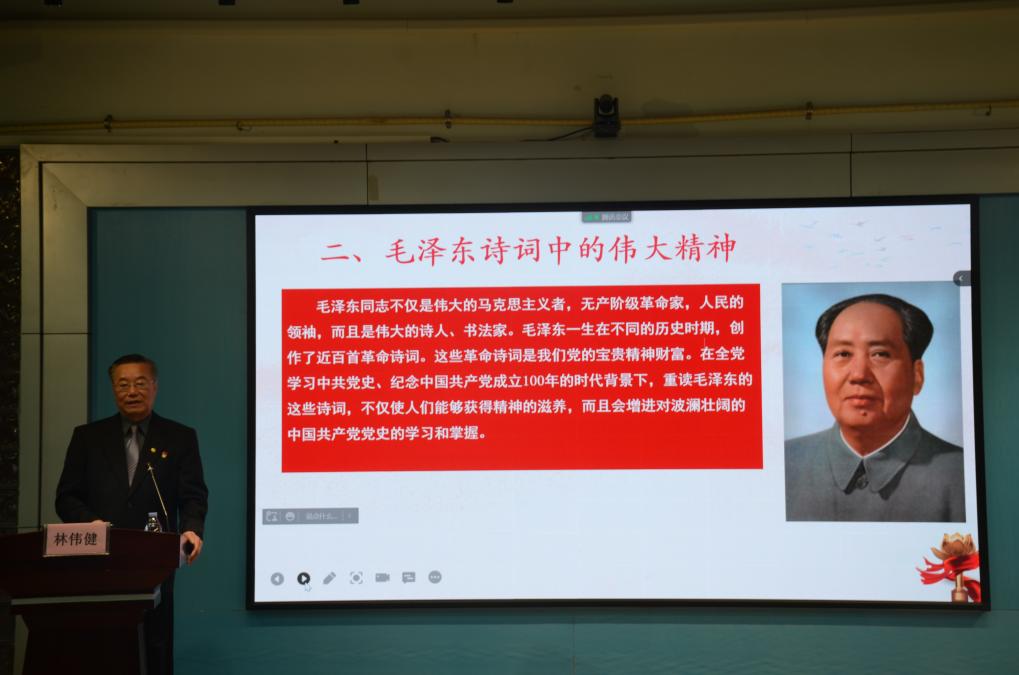 林偉健書記以《弘揚紅色精神 煥發(fā)青春熱情—從毛澤東詩詞中學(xué)中共黨史》為題,重點圍繞“偉大建黨精神構(gòu)建起了中國共產(chǎn)黨人的精神譜系”、“毛澤東詩詞中的偉大精神”、“偉人的風(fēng)采和情懷,激勵著我們奮進新時代”三個方面展開,通過對毛主席詩詞的解讀和賞析,讓大家從毛主席詩詞的創(chuàng)作背景、詩歌內(nèi)容、思想內(nèi)涵等方面,一起重溫黨的光輝歷史和豐功偉績,領(lǐng)略共產(chǎn)黨人的理想信念和初心使命,體悟先賢們深厚的愛國情懷和勇敢的責(zé)任擔(dān)當。林書記以平實親切的語言,鏗鏘有力的語調(diào),向同學(xué)們娓娓道來中國共產(chǎn)黨一路走來篳路藍縷的艱辛歷程,引導(dǎo)從紅色詩詞中感悟中國共產(chǎn)黨的百年奮斗歷程,深入領(lǐng)會中國共產(chǎn)黨人的革命精神與革命斗志,讓紅色詩詞激蕩心靈,堅定新時代青年學(xué)生的理想信念,樹立遠大理想;厚植愛國情懷,筑牢信仰之基。