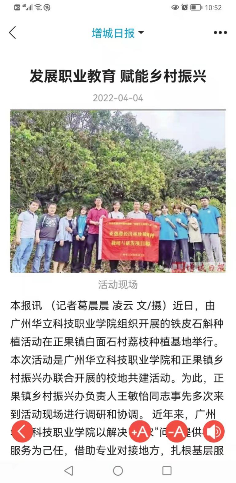 鄉(xiāng)村振興,教育有為。華立職院高度重視增強教育服務地方發(fā)展的能力,以高校服務農村產業(yè)革命項目為載體,將職業(yè)教育主動融入鄉(xiāng)村教育規(guī)劃發(fā)展,大力培養(yǎng)高素質農民。推動“鄉(xiāng)村振興人才培養(yǎng)計劃”,努力開展“紅色筑夢之旅”,在鄉(xiāng)村振興中做有溫度有良心的職業(yè)教育。2022年3月26日,教務處組織財經學院團隊來到增城區(qū)著名的愛國主義教育基地-白面石村開展了職業(yè)教育進鄉(xiāng)村的各項實踐活動。財經學院團隊在劉惠玲院長的帶領下,結合李向林教授的石斛種植項目,把愛家鄉(xiāng)教育作為課程思政和德育工作的重要方向,開展“記得住鄉(xiāng)愁”和“愛家鄉(xiāng)愛祖國”教育活動,開展勞動實踐教育活動,同時為我校的勞動教育實踐基地落戶白面石村打開了新局面。