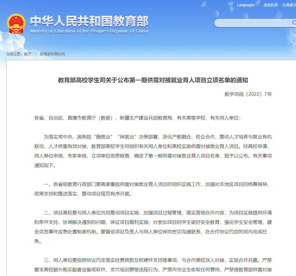 近日,教育部高校學(xué)生司《教育部高校學(xué)生司關(guān)于公布第一期供需對(duì)接就業(yè)育人項(xiàng)目立項(xiàng)名單的通知》(教學(xué)司函〔2022〕7號(hào)),我校獲得8項(xiàng)立項(xiàng)。其中,定向人才培訓(xùn)項(xiàng)目3項(xiàng),就業(yè)實(shí)踐基地項(xiàng)目3項(xiàng),人力資源項(xiàng)目培訓(xùn)2項(xiàng)。