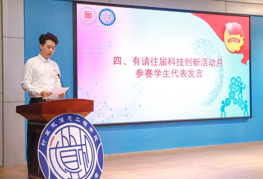 最后由往屆科技創(chuàng)新活動月參賽學生蘇洲同學代表發(fā)言,蘇洲同學分享了參加第一屆“數(shù)據(jù)引擎,智馭未來”科技創(chuàng)新活動月系列活動的心得,鼓勵大家積極參與,并預祝本屆“賡續(xù)百年榮光,勇攀科創(chuàng)高峰”科技創(chuàng)新活動月取得圓滿成功!