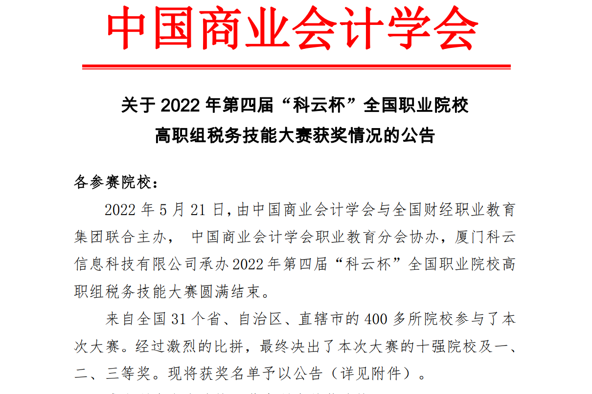 2022年5月21日,由中國商業(yè)會計學會、全國財經(jīng)職業(yè)教育集團主辦的2022年第四屆“科云杯”全國職業(yè)院校高職組稅務技能大賽在云端成功舉辦。本屆大賽歷時2個多月,全國400多所院校共590多支隊伍報名參賽。