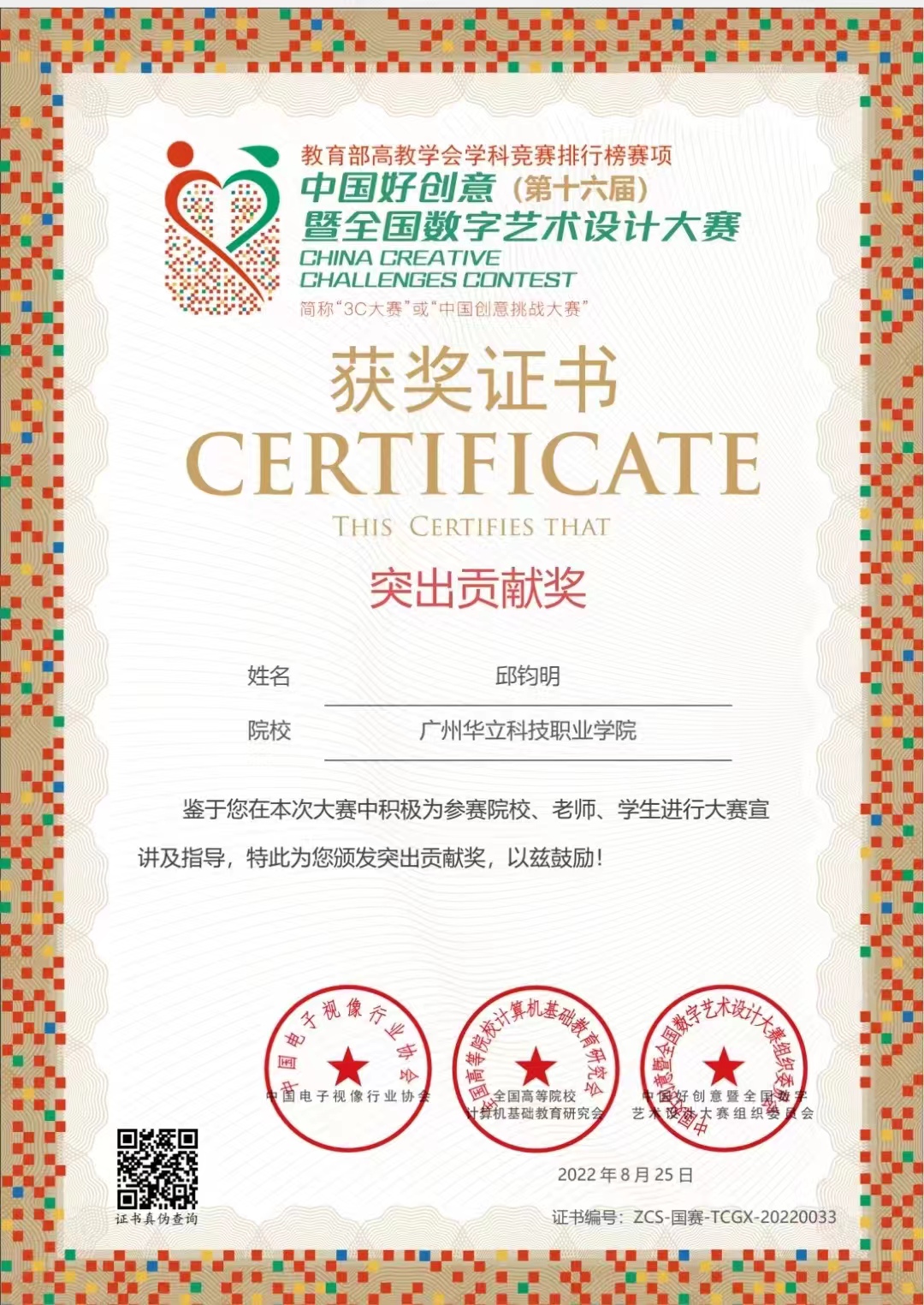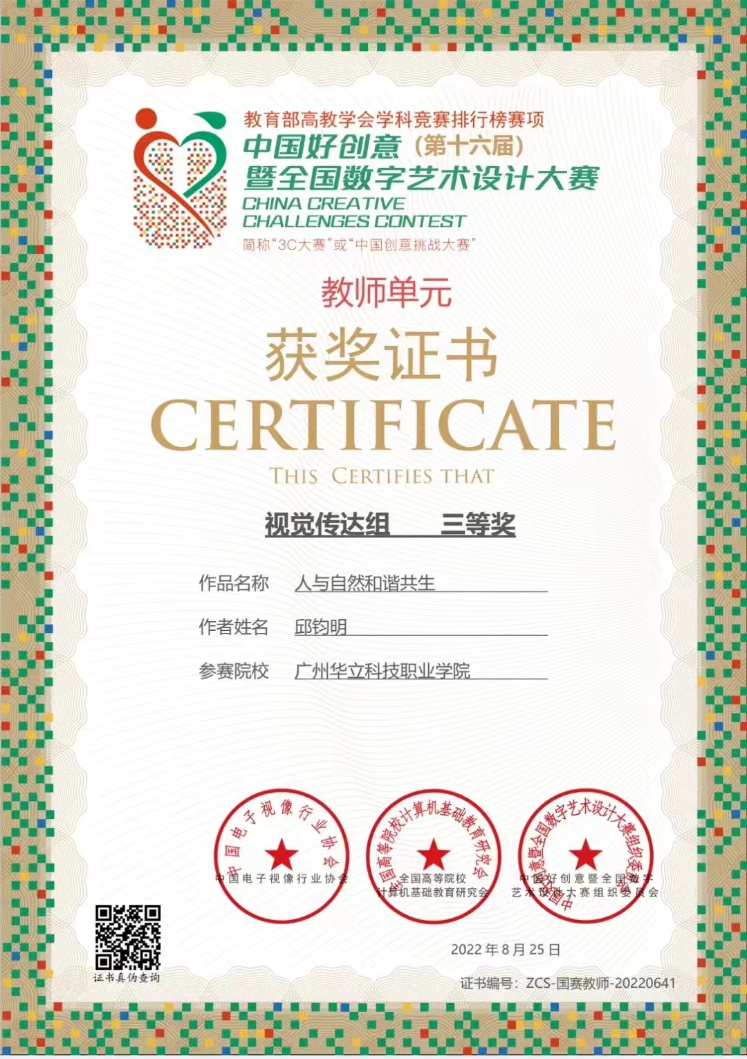 科研項(xiàng)目結(jié)碩果,國賽也傳來捷報(bào)。第16屆中國好創(chuàng)意暨全國數(shù)字藝術(shù)設(shè)計(jì)大賽上,教育學(xué)院邱鈞明老師的作品“人與自然和諧共生”獲得了國賽單元視覺傳達(dá)組三等獎(jiǎng)和個(gè)人突出貢獻(xiàn)獎(jiǎng)!