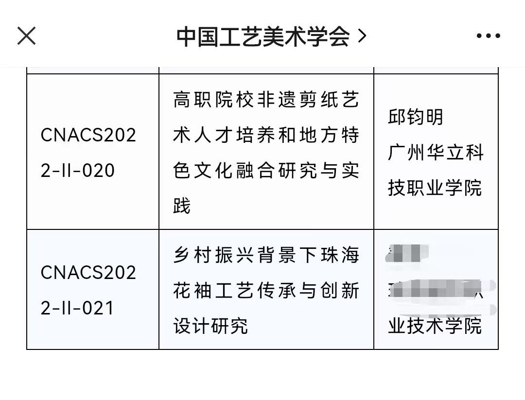 近日,從中國工藝美術(shù)學(xué)會(huì)傳來喜訊,廣州華立科技職業(yè)學(xué)院教育學(xué)院邱鈞明老師申報(bào)的課題《高職院校非遺剪紙藝術(shù)人才培養(yǎng)和地方特色文化融合研究與實(shí)踐》獲得中國工藝美術(shù)學(xué)會(huì)2022年度工藝美術(shù)科研課題研究項(xiàng)目立項(xiàng)!