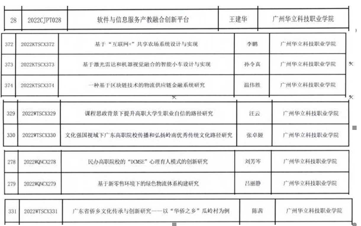 近日,廣東省教育廳公布了2022年度普通高校重點(diǎn)科研平臺和項目立項(含認(rèn)定類)名單,我校共9個項目獲批立項。其中,2022年度普通高校重點(diǎn)科研平臺1個:《軟件與信息服務(wù)產(chǎn)教融合創(chuàng)新平臺》(負(fù)責(zé)人:王建華)。2022年度廣東高校科研平臺和項目8個。特色創(chuàng)新項目(自然科學(xué))3個;特色創(chuàng)新類項目(哲學(xué)社會科學(xué))3個;青年創(chuàng)新人才項目2個。具體立項情況見下表截圖。