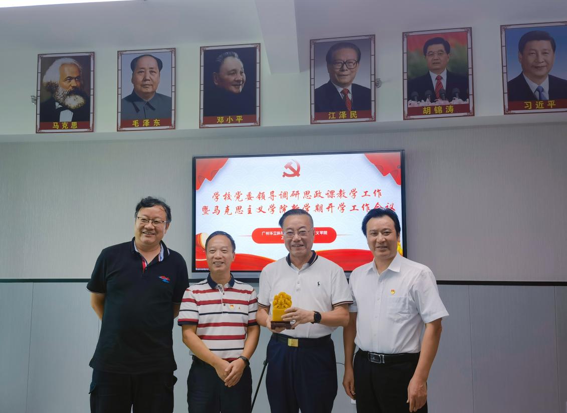 首先,廖良初院長代表全體思政課教師向陳良聲書記一行的到來表示熱烈歡迎和衷心感謝,并向全體教師重點介紹新任黨委書記兼督導(dǎo)專員陳良聲同志。他說,陳良聲同志是教育工委從廣東工業(yè)大學(xué)選派來的一位政治站位高、業(yè)務(wù)水平高和紀(jì)律作風(fēng)嚴(yán)的好干部,是一位優(yōu)秀的黨委書記。相信有陳書記帶領(lǐng)和指導(dǎo),馬克思主義學(xué)院將會繼續(xù)更快更好發(fā)展。同時,廖院長在講話中就學(xué)校原黨委書記林偉健同志對學(xué)院的領(lǐng)導(dǎo)、支持和關(guān)心給予了高度評價,并表示衷心感謝!