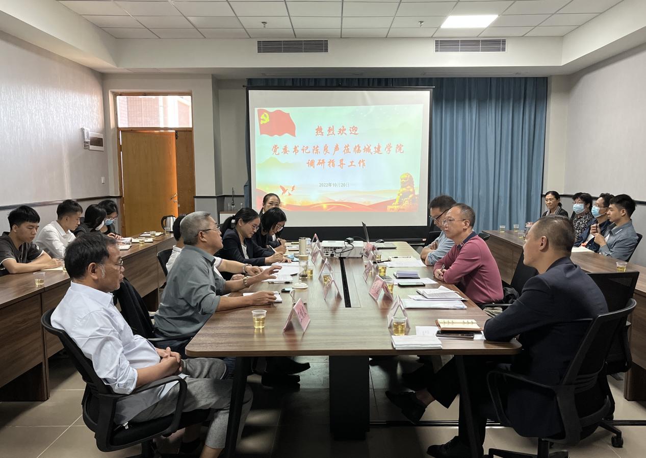 2022年10月20日下午,學(xué)校黨委書記陳良聲到城建學(xué)院、教育學(xué)院調(diào)研指導(dǎo)工作,黨委辦公室副主任孟允煌、云浮校區(qū)黨總支副書記蘇秦、團(tuán)委副書記李同同陪同調(diào)研。城建學(xué)院院長陳積光、教育學(xué)院院長馬岳良、城建學(xué)院黨總支書記李桂林及部分教師參加了調(diào)研活動(dòng)。