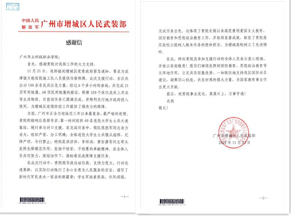 11月23日,我校收到增城區(qū)武裝部的感謝信,感謝我校武裝部帶領廣大退役大學生士兵參加抗疫工作。