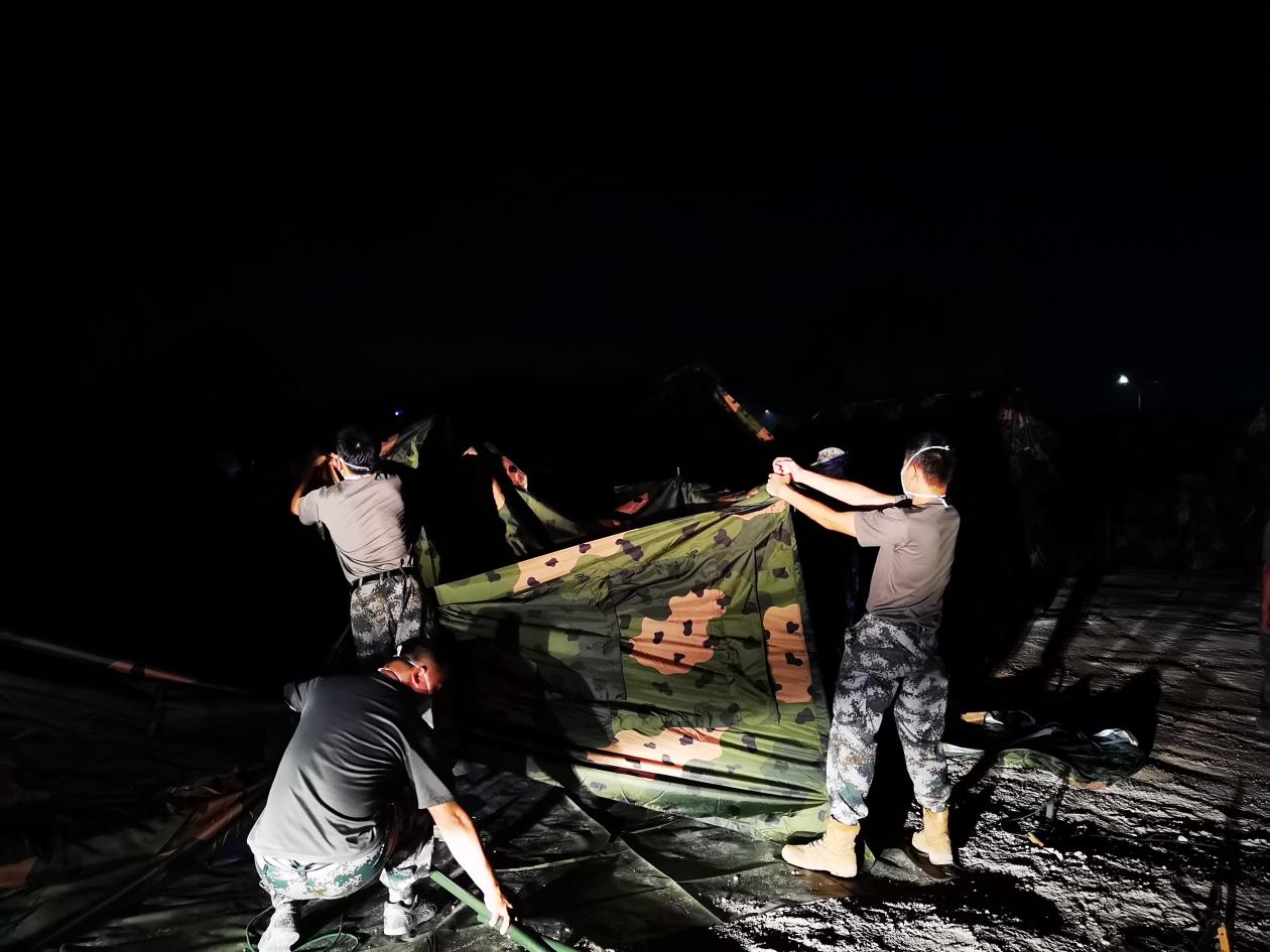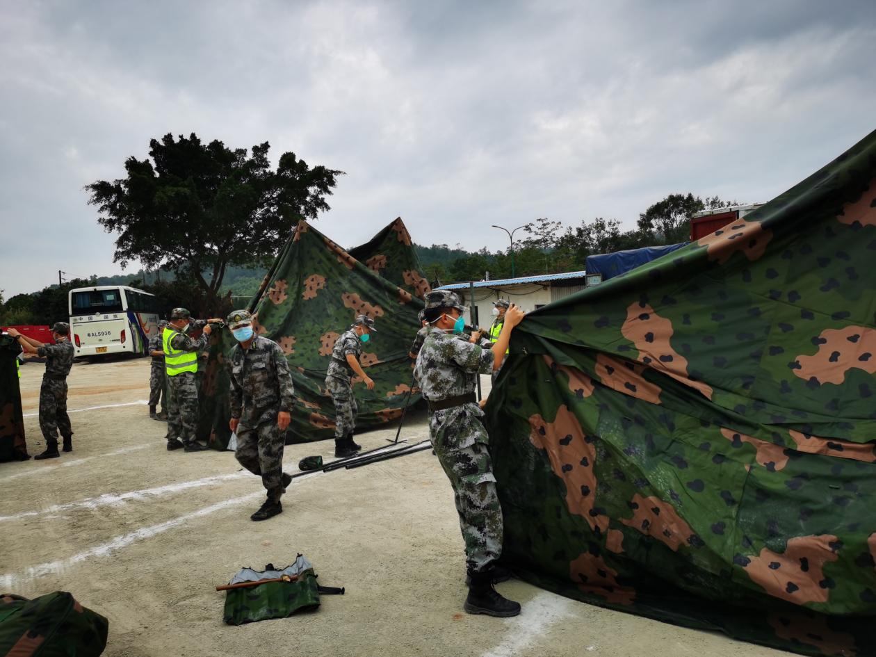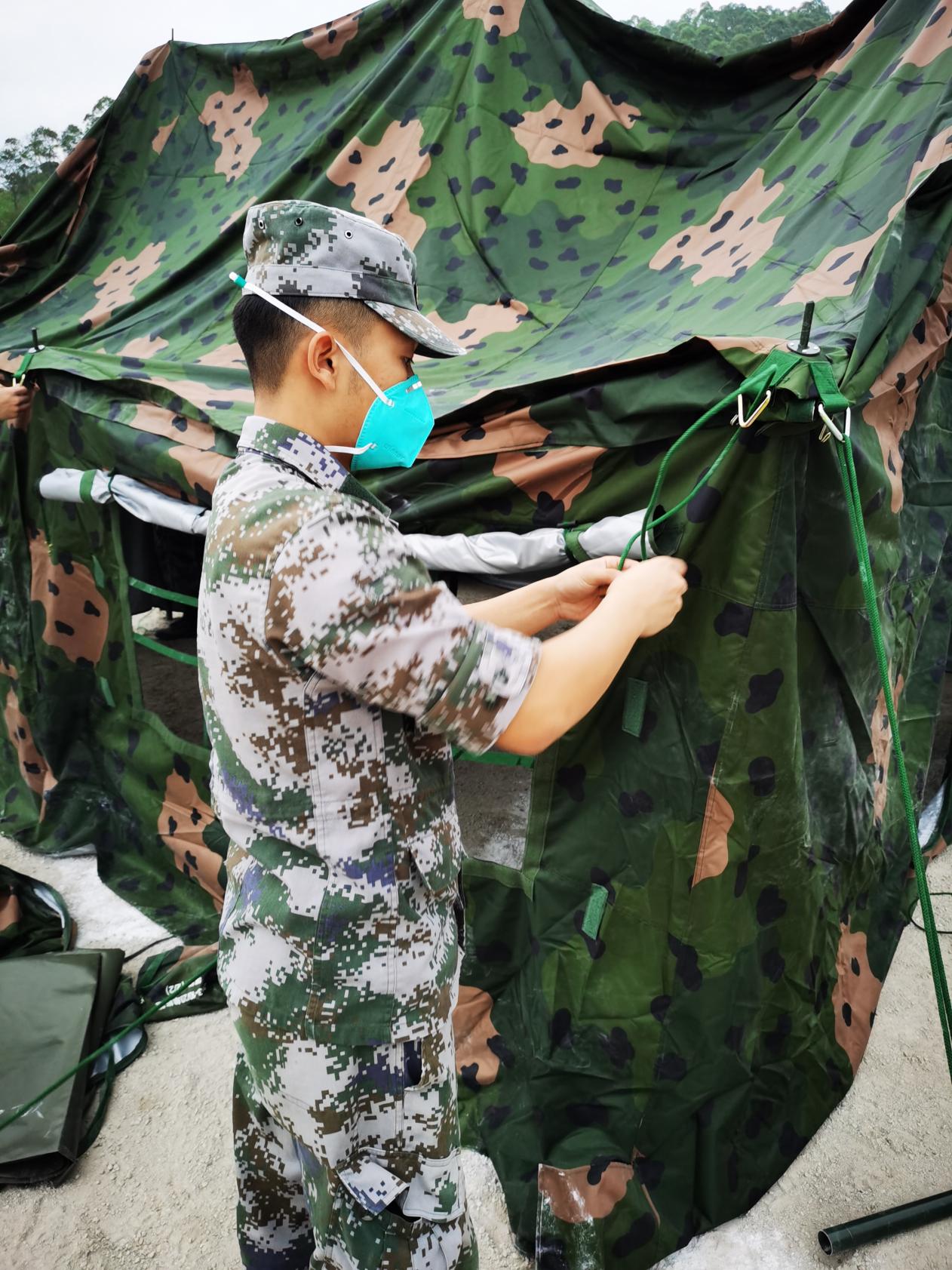 在全體人員的共同努力、團結協(xié)作下,經(jīng)過6個多小時的奮戰(zhàn),高標準完成此次保障支援任務,共完成了21頂軍用帳篷、68頂民用帳篷的搭設,保障了320個床位和床上用品等生活物資,順利交付政府投入使用,為增城區(qū)疫情防控工作提供了強有力的保障。支援行動結束后,我校收到中國人民解放軍廣州市增城區(qū)人民武裝部發(fā)來的感謝信,特別感謝我院對此次工作的大力支持,并高度贊賞領隊陳勝軍同志的嚴密組織工作,同時表揚我院退役學生的積極配合并出色完成工作任務,特別是洪濟沛、李祥鴻、黃安瀟等同學的奉獻精神。