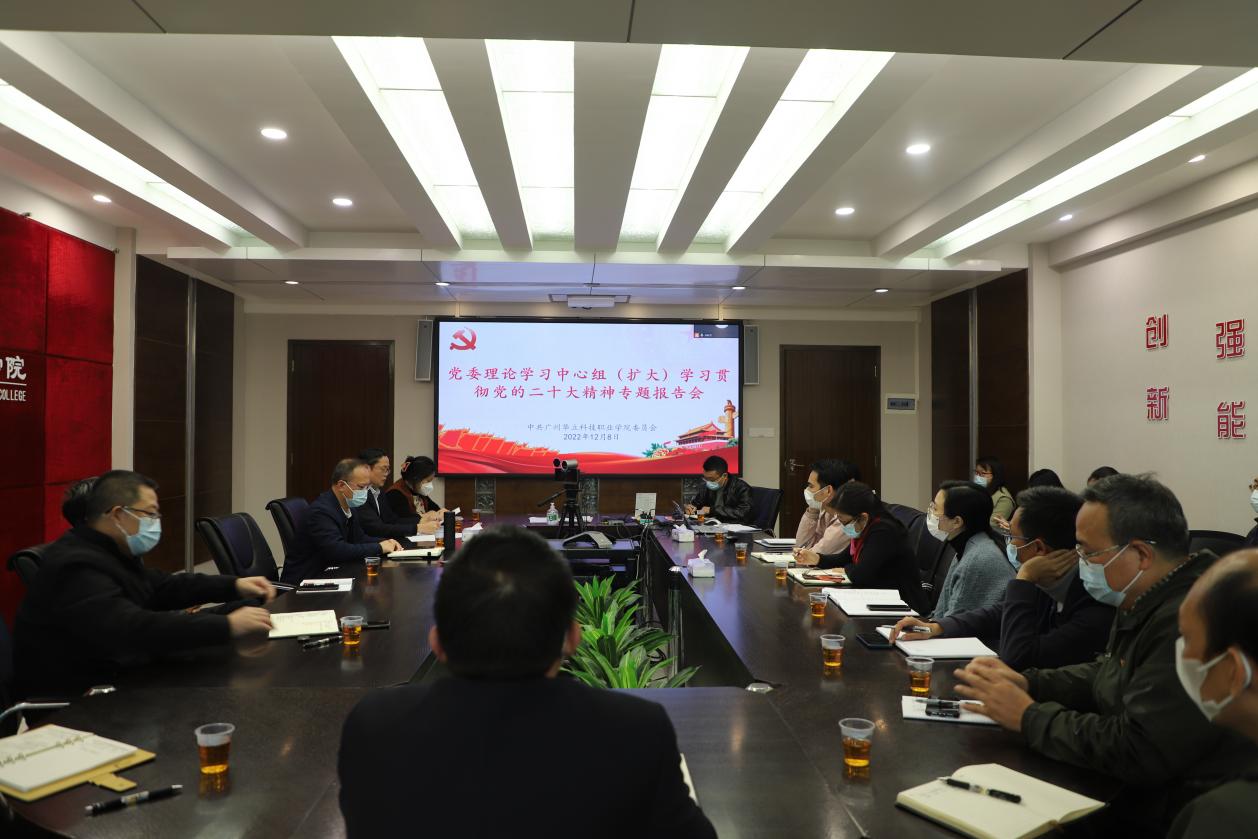 2022年12月8日下午,廣州華立科技職業(yè)學(xué)院黨委理論中心組(擴(kuò)大)在行政樓305會(huì)議室舉行第二次學(xué)習(xí)貫徹黨的二十大精神專題報(bào)告會(huì)。學(xué)校黨委書記陳良聲,校長易健民,副書記、副校長高堯來,副校長陳顯強(qiáng)以及各黨總支、直屬黨支部負(fù)責(zé)人,全體思政教師、教師黨員代表參加了會(huì)議。會(huì)議由黨委辦公室主任孟允煌主持。我校云浮校區(qū)領(lǐng)導(dǎo)干部也通過視頻連線參加了本次專題學(xué)習(xí)。