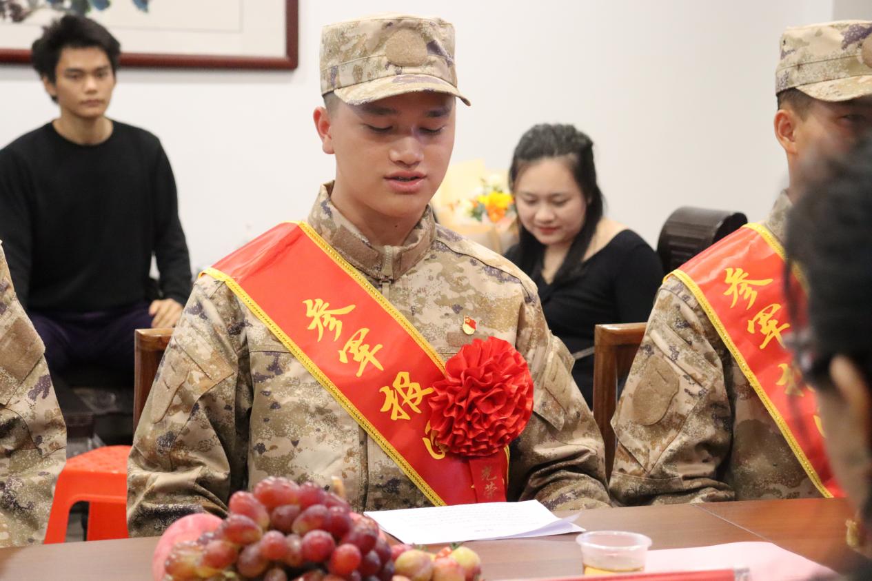 新兵入伍歡送會在行政樓3樓會議室召開,4名新兵身著戎裝,頭戴軍帽,胸佩大紅花和彩帶,神采飛揚、意氣風發(fā)。會議共六項議程,首先由新兵代表林浩作了振奮人心的發(fā)言,他表示有這個特別的機會去學習鍛煉和報效祖國感到無比光榮,將會在部隊努力學習,不怕吃苦,堅決服從命令,聽從指揮,刻苦訓練,勤學本領,做到政治合格、軍事過硬、作風優(yōu)良、紀律嚴明、保障有力、精忠報國,為國家的和平與安寧扛好槍、站好崗,表達了自己保家衛(wèi)國的堅定決心。第二第三項議程是分別是新兵家長和輔導員發(fā)表講話,希望即將入伍的4名新兵牢記初心,用汗水磨練意志,用熱血鑄就軍魂,扎根軍營建功立業(yè),成就精彩人生,為家鄉(xiāng)增光添彩。