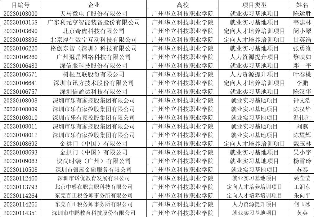 2023年4月6日,教育部發(fā)布了《教育部高校學(xué)生司關(guān)于公布第二期供需對(duì)接就業(yè)育人項(xiàng)目立項(xiàng)名單的通知》 (教學(xué)司函〔2023〕6號(hào)),廣州華立科技職業(yè)學(xué)院申請(qǐng)的24個(gè)項(xiàng)目立項(xiàng)成功,其中就業(yè)實(shí)習(xí)基地項(xiàng)目15項(xiàng),定向人才培養(yǎng)培訓(xùn)項(xiàng)目6項(xiàng),人力資源提升項(xiàng)目3項(xiàng),立項(xiàng)為全省民辦高校第一名。