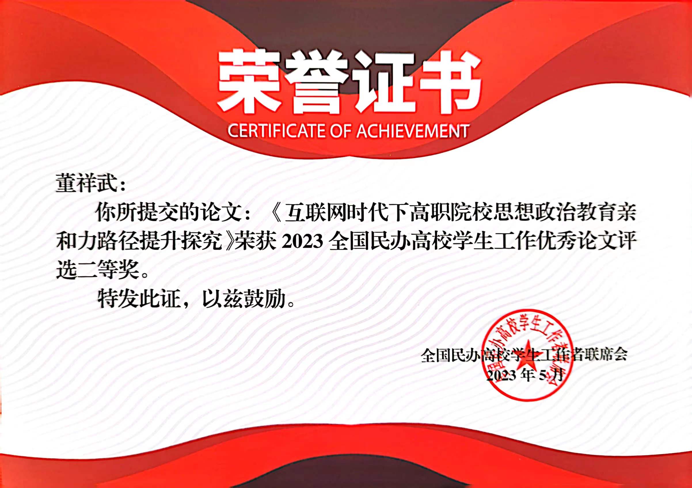 在本屆研討會中,我校學(xué)工團(tuán)隊研究成果豐碩,獲得多項榮譽,其中藝術(shù)與傳媒學(xué)院學(xué)管負(fù)責(zé)人劉嘉怡老師主持的案例《黨建鑄魂,文化賦能構(gòu)建藝術(shù)專業(yè)學(xué)生管理育人新模式》榮獲2023全國民辦高校學(xué)生工作創(chuàng)新獎二等獎。董祥武老師的創(chuàng)新論文《互聯(lián)網(wǎng)時代下高職院校思想政治教育親和力路徑提升探究》榮獲2023全國民辦高校學(xué)生工作優(yōu)秀論文評選二等獎。黨委學(xué)生工作部部長宋海泉老師主持的《民辦高校公寓(社區(qū))管理改革》案例、曹廣福老師主持的《基于網(wǎng)絡(luò)化治理的高校宿舍管理模式構(gòu)建》案例分別榮獲2022全國民辦高校學(xué)生工作組織改革三等獎和二等獎。