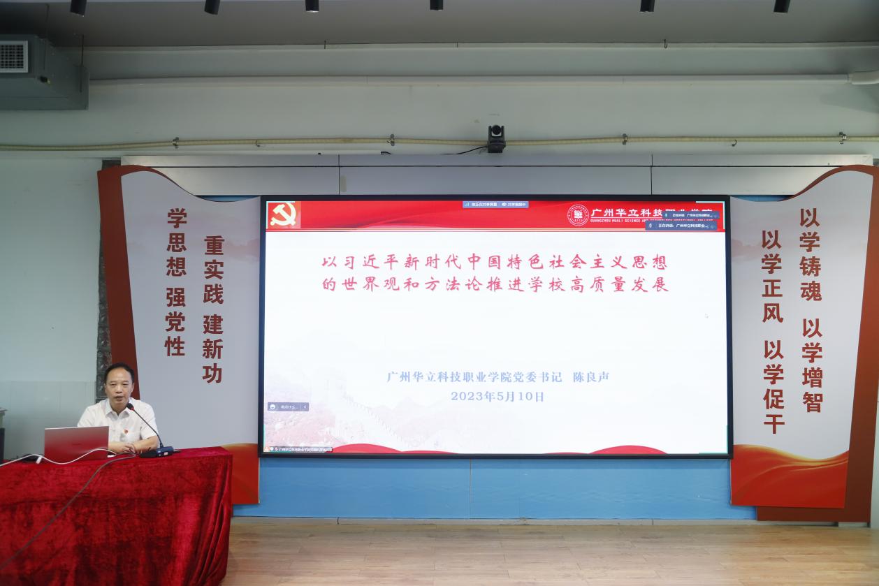 陳良聲指出,用習(xí)近平新時(shí)代中國(guó)特色社會(huì)主義思想的世界觀和方法論推動(dòng)學(xué)校高質(zhì)量發(fā)展:一是堅(jiān)持人民至上,要視生如子,堅(jiān)持以師生為本,堅(jiān)持人的全面發(fā)展,堅(jiān)持立德樹人、三全育人、授道解惑,聚焦學(xué)生成長(zhǎng)成才,要及時(shí)解決師生急難愁盼問題,以個(gè)人發(fā)展推動(dòng)學(xué)校發(fā)展、以學(xué)校發(fā)展支持個(gè)人發(fā)展;二是堅(jiān)持自信自立,加強(qiáng)“黨建雙創(chuàng)”(高校黨建工作示范創(chuàng)建和質(zhì)量創(chuàng)優(yōu))、發(fā)力“雙高計(jì)劃”(中國(guó)特色高水平高職學(xué)校和專業(yè)建設(shè)計(jì)劃),努力開創(chuàng)學(xué)校發(fā)展新格局;三是堅(jiān)持守正創(chuàng)新,結(jié)合學(xué)科特點(diǎn),挖掘黨建亮點(diǎn),發(fā)揮學(xué)校基層黨組織戰(zhàn)斗堡壘作用和黨員先鋒模范作用,推進(jìn)黨建工作和學(xué)校事業(yè)發(fā)展深度融合;四是堅(jiān)持問題導(dǎo)向,不斷增強(qiáng)學(xué)校的生存力、競(jìng)爭(zhēng)力、發(fā)展力、持續(xù)力;五是堅(jiān)持系統(tǒng)觀念,堅(jiān)持教育發(fā)展、科技創(chuàng)新、人才培養(yǎng)一體推進(jìn),堅(jiān)持原始創(chuàng)新、集成創(chuàng)新、開放創(chuàng)新一體設(shè)計(jì),堅(jiān)持創(chuàng)新鏈、產(chǎn)業(yè)鏈、人才鏈一體部署。強(qiáng)化政治安全和意識(shí)形態(tài)安全,加強(qiáng)意識(shí)形態(tài)陣地管理,極力營(yíng)造安全有序校園環(huán)境;六是堅(jiān)持胸懷天下,要加強(qiáng)國(guó)際交流、校際交往、院際溝通、產(chǎn)教融合、科教融匯、校企合作,為建設(shè)新時(shí)代高質(zhì)量的職業(yè)教育協(xié)同發(fā)力。