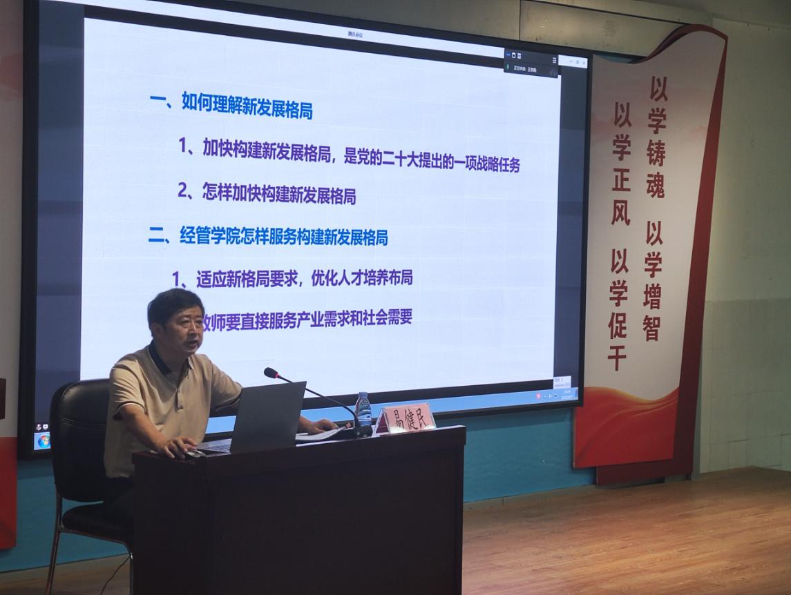 為推動(dòng)學(xué)習(xí)貫徹習(xí)近平新時(shí)代中國特色社會(huì)主義思想主題教育走深走實(shí),2023年6月7日下午,校長易健民教授、博士應(yīng)邀到經(jīng)濟(jì)管理學(xué)院開講專題黨課。易校長將自己研讀習(xí)近平總書記在《求是》雜志2023年第8期發(fā)表的文章和4月中旬視察廣東的重要講話、重要指示精神后的所思所感,結(jié)合當(dāng)前國內(nèi)外宏觀經(jīng)濟(jì)形勢分析,為經(jīng)濟(jì)管理學(xué)院師生黨員代表上了一堂立意深遠(yuǎn)、思想深刻的黨課。學(xué)校科研處處長溫偉勝、產(chǎn)教融合辦主任劉宇赤,經(jīng)管學(xué)院院長程玉賢、黨總支書記朱少先、副院長劉軍根以及兩校區(qū)教師黨員和學(xué)生代表(校區(qū)間視頻連線)共100多人參加了此次專題黨課學(xué)習(xí)。