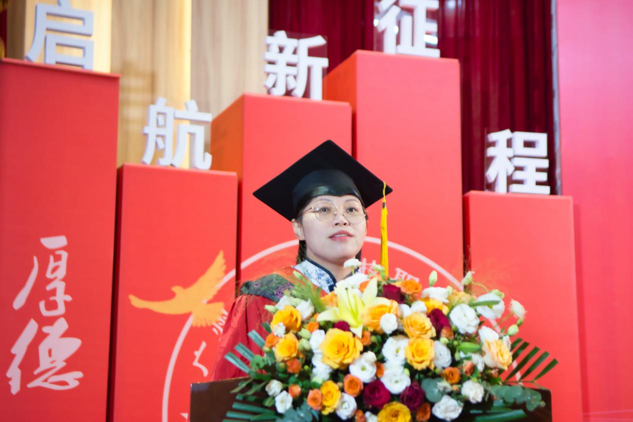 教育學(xué)院的謝梓婷同學(xué)代表2023屆全體畢業(yè)生進(jìn)行發(fā)言。她說到,感謝學(xué)校的悉心栽培,母校生活不只豐富了我們的知識,提升了我們的技能,更磨煉了我們的意志。感恩母校給予我們一個又一個登高望遠(yuǎn)的階梯,讓我們有能力有底氣站到更高的舞臺,不斷成長。表示自己會一直銘記“厚德 強(qiáng)能 務(wù)實 創(chuàng)新”的校訓(xùn),并身體力行。經(jīng)濟(jì)管理學(xué)院畢業(yè)生代婷婷發(fā)言時回顧自己大學(xué)三年的學(xué)習(xí)生活。她表示,要用行動和奮斗書寫屬于新時代華立人的多彩篇章。