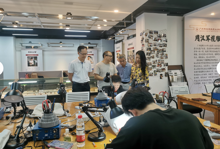 在欖雕基地,評建辦李艷華主任介紹了我?!皬V州欖雕”基地項目在2022年獲批廣東省高校第四批中華優(yōu)秀傳統(tǒng)文化傳承基地立項建設(shè),基地在人才培養(yǎng)、課程建設(shè)和科研方面成果豐碩。“廣州欖雕”代表性傳承人周漢軍大師介紹了工作室的情況,工作室自成立以來以欖雕技藝傳承為載體,將欖雕文化傳承融入人才培養(yǎng),已培養(yǎng)青年傳承骨干30余人,團(tuán)隊設(shè)計開發(fā)欖雕文創(chuàng)作品100余件。湯麗玲主席對欖雕基地高度贊同,希望學(xué)校和周大師繼續(xù)將增城傳統(tǒng)文化發(fā)揚(yáng)光大,讓更多人接觸這項技藝。