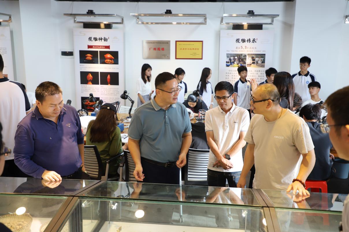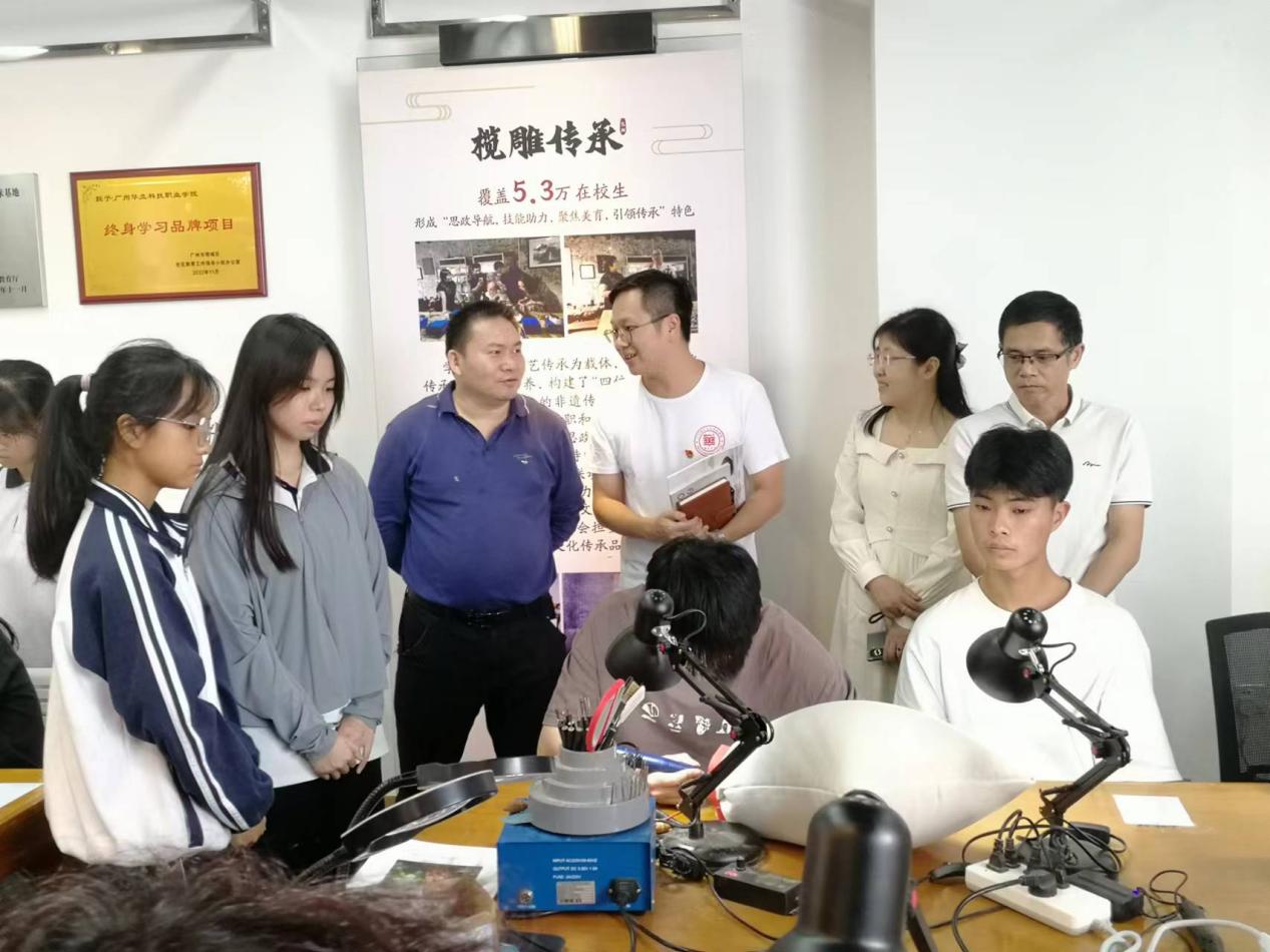 座談會后,黃勁勇副局長一行和增城區(qū)廣播電視大學(xué)師生一起到我校廣州欖雕中華優(yōu)秀傳統(tǒng)文化基地進(jìn)行實(shí)地考察,與基地教師和學(xué)生進(jìn)行了交流,深入了解基地欖雕教學(xué)開展情況,并對非遺進(jìn)校園建設(shè)的細(xì)節(jié)提出了建設(shè)性意見。