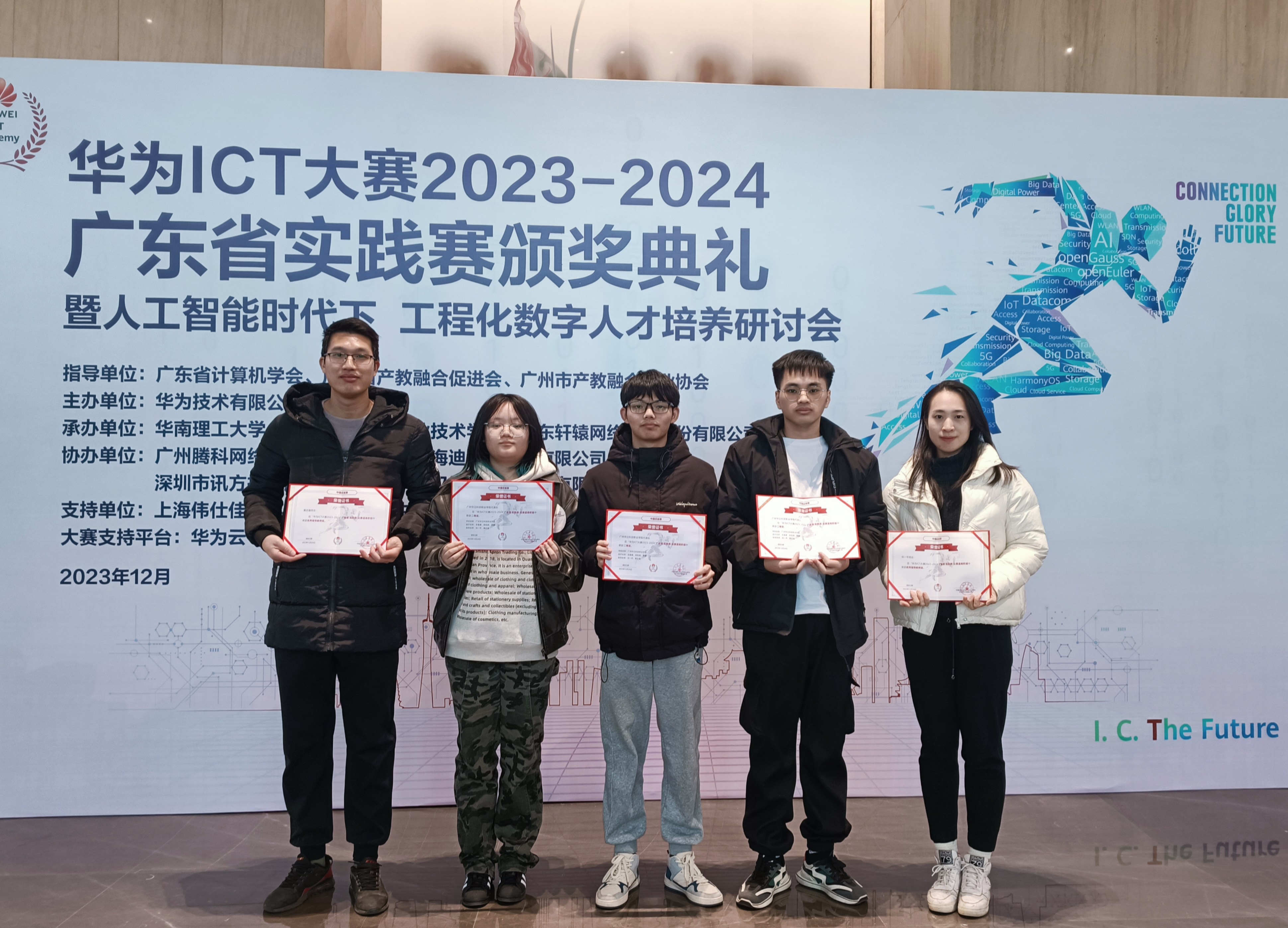 在2023年10月至12月舉行的華為ICT大賽中,由我校計(jì)算機(jī)學(xué)院學(xué)生歐陽政、史嘉豪(云浮校區(qū))、黎靜(廣州校區(qū))和指導(dǎo)老師鄧一平、黃志強(qiáng)組成的參賽小組獲得廣東省實(shí)踐賽決賽云賽道高職組二等獎(jiǎng)一項(xiàng),另有2個(gè)參賽小組分別獲得計(jì)算賽道和網(wǎng)絡(luò)賽道的三等獎(jiǎng)2項(xiàng)。部分獲獎(jiǎng)學(xué)生和指導(dǎo)老師出席了12月24日在廣州舉行的頒獎(jiǎng)典禮。