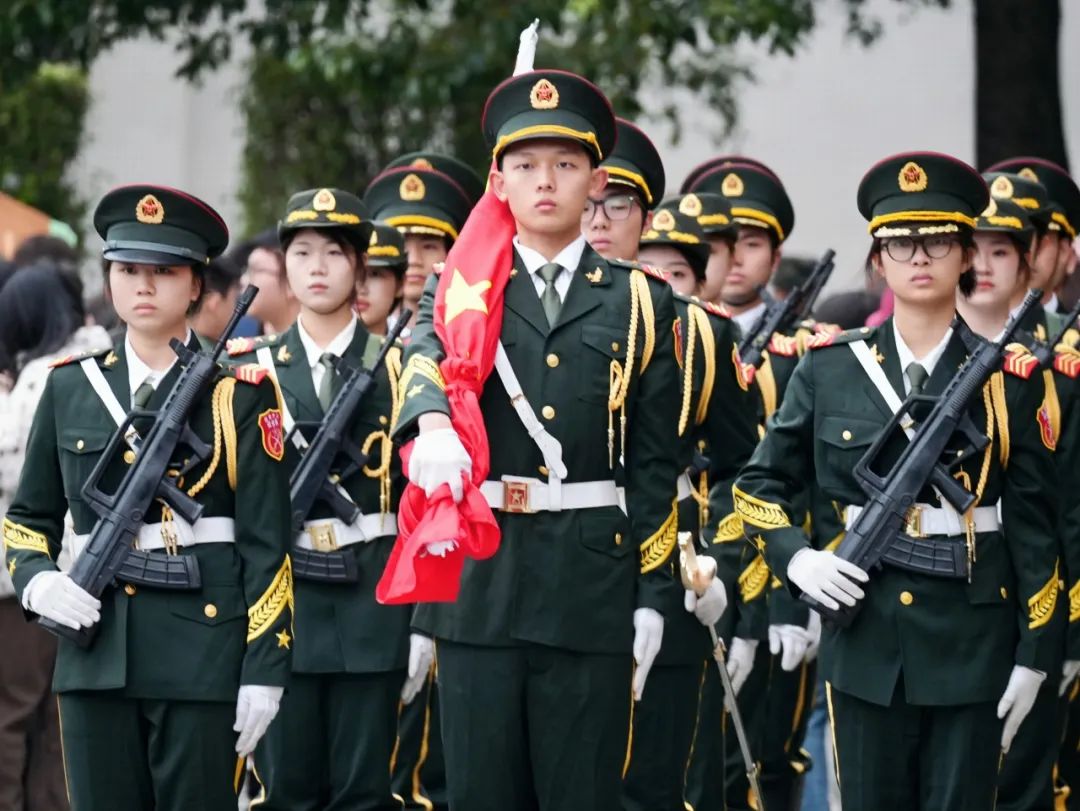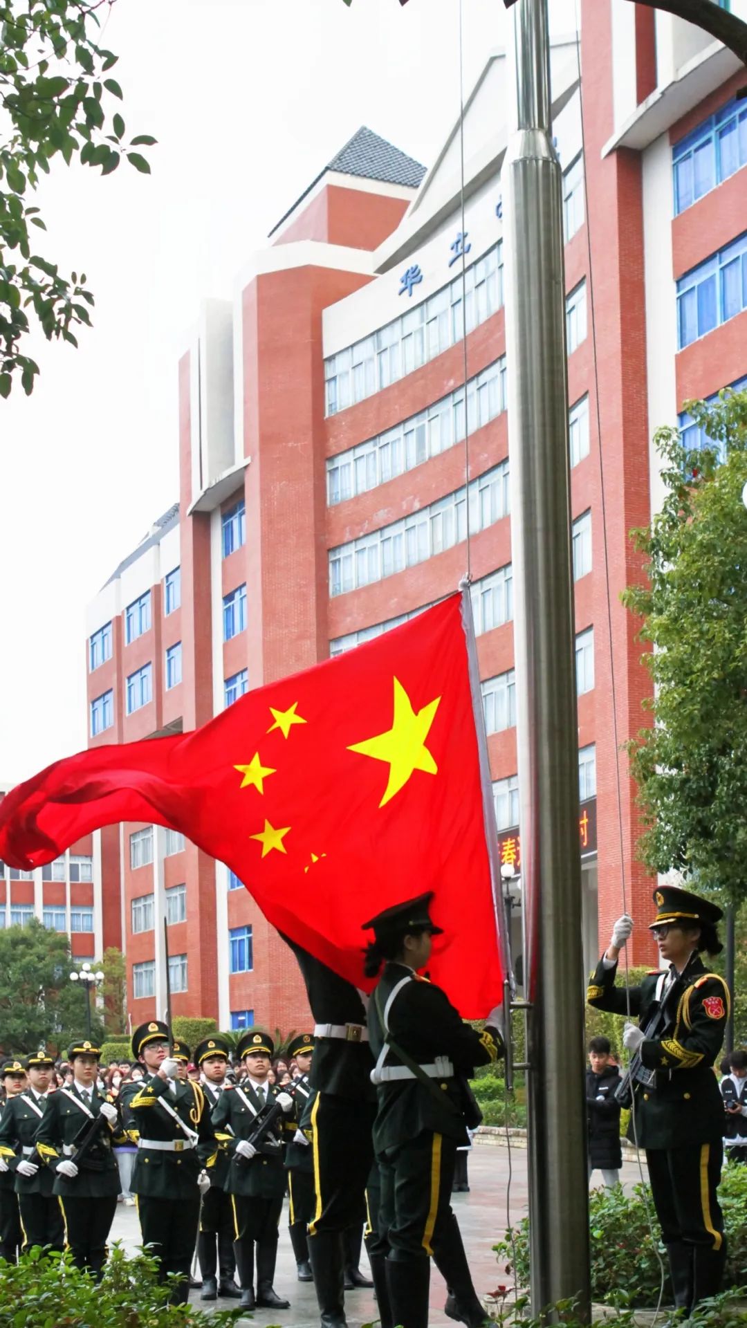 在春日的和風(fēng)中,國(guó)旗護(hù)衛(wèi)隊(duì)邁著鏗鏘有力的步伐,在莊嚴(yán)的國(guó)歌中,五星紅旗冉冉升起,全體師生注目行禮。