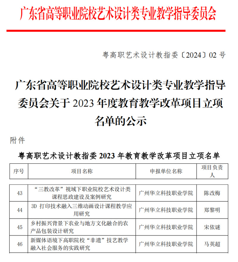 近日,廣東省高等職業(yè)院校藝術(shù)設(shè)計(jì)類專業(yè)教學(xué)指導(dǎo)委員會(huì)公布了2023年度教育教學(xué)改革項(xiàng)目立項(xiàng)結(jié)果。藝傳學(xué)院陳改梅、鄭黎明、宋依謎、馬英超老師的《“三教改革”視域下職業(yè)院校藝術(shù)設(shè)計(jì)類課程思政建設(shè)及案例研究》、《3D打印技術(shù)融入三維動(dòng)畫設(shè)計(jì)課程教學(xué)應(yīng)用研究》、《鄉(xiāng)村振興背景下農(nóng)業(yè)與地方文化融合的農(nóng)產(chǎn)品包裝設(shè)計(jì)研究》、《新媒體語(yǔ)境下高職院?!胺沁z”技藝教學(xué)融入社會(huì)服務(wù)的實(shí)踐研究》獲得立項(xiàng)。此次教學(xué)改革課題獲得立項(xiàng),是學(xué)校領(lǐng)導(dǎo)重視科研工作及藝傳學(xué)院教師積極參與藝術(shù)設(shè)計(jì)類專業(yè)教學(xué)改革的結(jié)果。