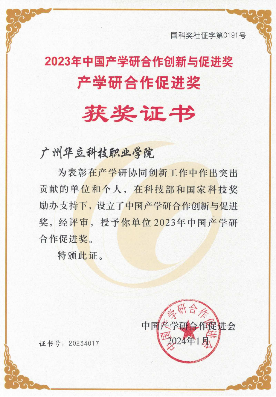 中國產(chǎn)學(xué)研合作創(chuàng)新與促進(jìn)獎(jiǎng)是經(jīng)科技部和國家科技獎(jiǎng)勵(lì)工作辦公室批準(zhǔn),由中國產(chǎn)學(xué)研合作促進(jìn)會(huì)設(shè)立的在產(chǎn)學(xué)研合作方面的全國性獎(jiǎng)項(xiàng), 也是中國產(chǎn)學(xué)研協(xié)同創(chuàng)新領(lǐng)域的最高榮譽(yù)獎(jiǎng),以表彰在推進(jìn)“政產(chǎn)學(xué)研金服用”深度融合中做出突出貢獻(xiàn)的先進(jìn)單位及個(gè)人。大會(huì)授予廣州華立科技職業(yè)學(xué)院“中國產(chǎn)學(xué)研合作促進(jìn)獎(jiǎng)”單位。