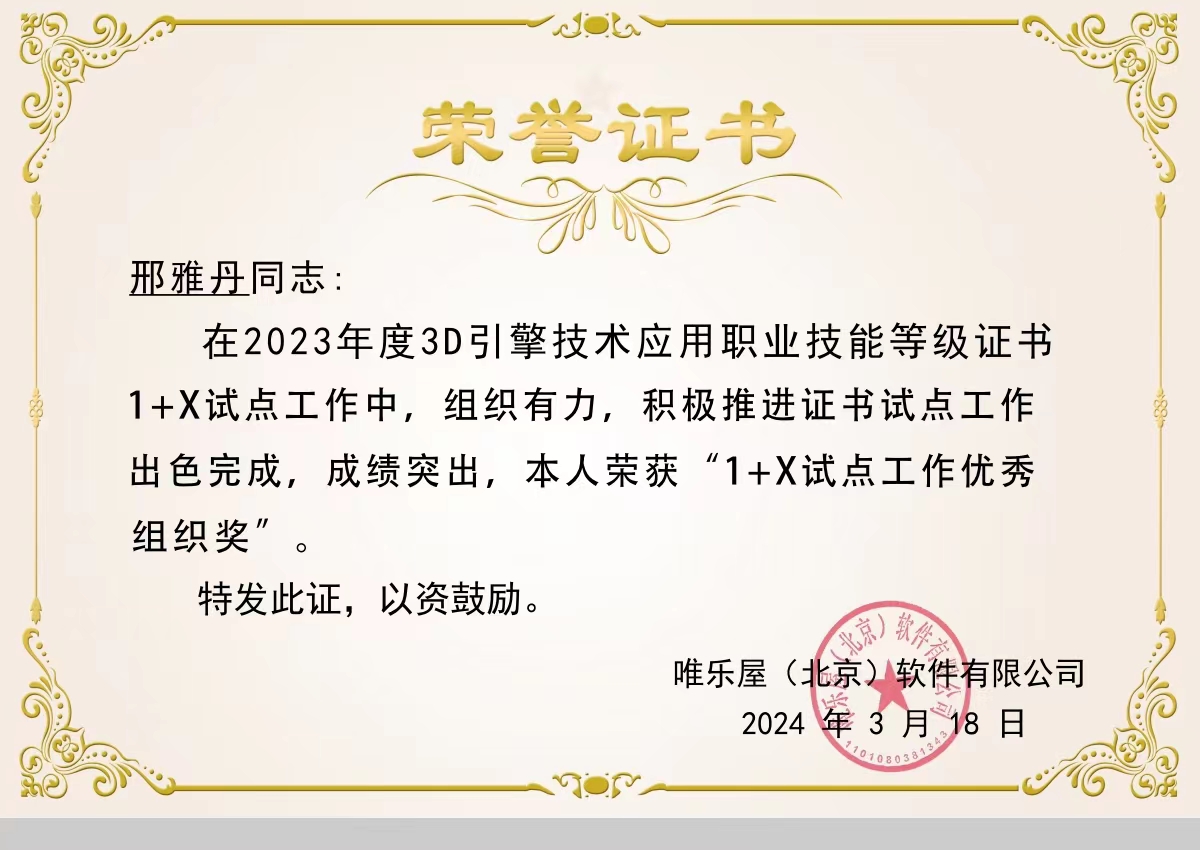 2024年3月18日,藝術(shù)與傳媒學(xué)院在國家指定1+X職業(yè)院校職業(yè)證書認(rèn)證單位唯樂屋年度表彰大會上獲得“1+X試點(diǎn)工作優(yōu)秀院校”、“優(yōu)秀組織獎”、“優(yōu)秀教師”、“優(yōu)秀考評員”獎項(xiàng)。