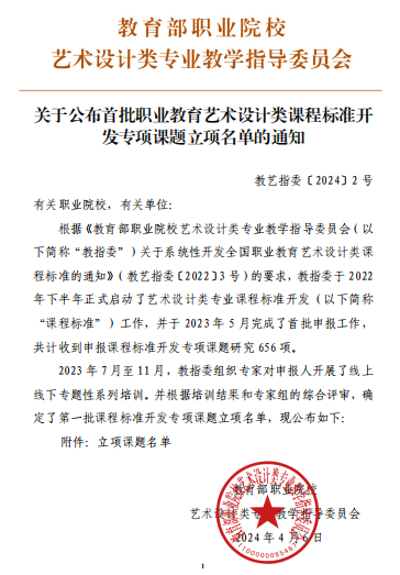 我校教師獲教育部職業(yè)院校藝術設計類專業(yè)教學指導委員會“首批課程標準開發(fā)專項課題”立項2項