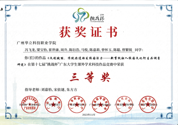 近期,在第十七屆“挑戰(zhàn)杯”廣東大學生課外學術科技作品競賽中,我院學生項目榮獲省級三等獎兩項。