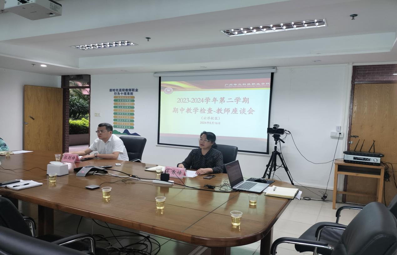 2024年5月16日,我校廣州校區(qū)和云浮校區(qū)分別召開了期中教學(xué)檢查教師座談會(huì)。副校長陳顯強(qiáng)、校長助理張劍鋒、教務(wù)處處長吳青峰、實(shí)訓(xùn)中心主任張磊、教務(wù)處副處長曾英姿、陳茜及教學(xué)管理人員與各二級(jí)學(xué)院教師代表參加座談會(huì)。其中廣州校區(qū)教師座談會(huì)由曾英姿副處長主持,在廣州校區(qū)圖書館104舉行;云浮校區(qū)由吳青峰處長主持,在云浮校區(qū)圖書館1樓會(huì)議室舉行。