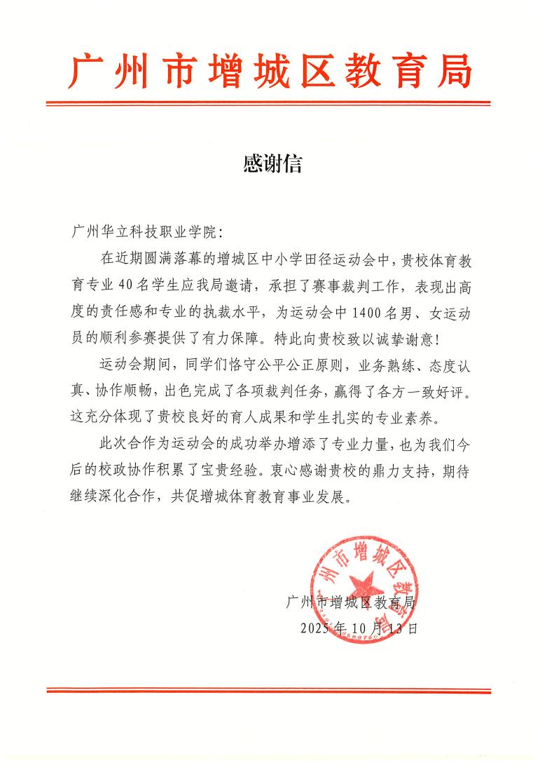 近日,我校藝術(shù)與傳媒學(xué)院收到來(lái)自增城區(qū)教育局的感謝信,對(duì)學(xué)院48名體育教育專業(yè)學(xué)生在“廣州市增城區(qū)中小學(xué)田徑運(yùn)動(dòng)會(huì)”中擔(dān)任裁判員所展現(xiàn)出的專業(yè)素養(yǎng)與敬業(yè)精神表示高度贊揚(yáng)和誠(chéng)摯感謝。此前,這批學(xué)子于2025年9月28日至30日受增城區(qū)教育局正式邀請(qǐng),為運(yùn)動(dòng)會(huì)中1400名男、女運(yùn)動(dòng)員提供賽事執(zhí)裁服務(wù),同時(shí)他們以嚴(yán)謹(jǐn)?shù)膽B(tài)度、公正的判罰和出色的團(tuán)隊(duì)協(xié)作,贏得主辦方與參賽師生的一致好評(píng)。
