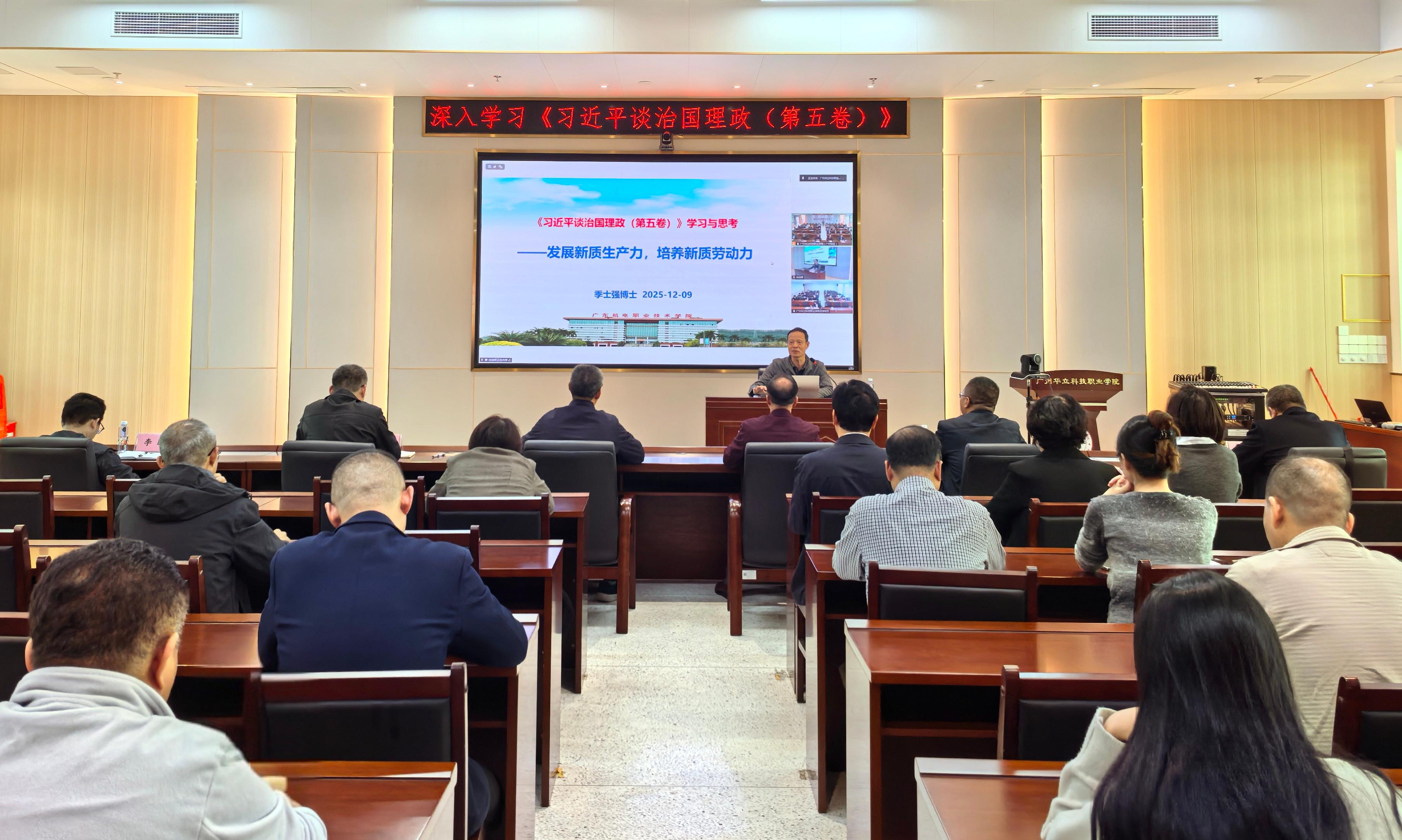 根據(jù)上級組織關(guān)于深入學(xué)習(xí)《習(xí)近平治國理政》(第五卷)的工作部署和我校落實(shí)省委教育工委關(guān)于開展公辦高校與民辦高校黨建和思想政治工作結(jié)對共建工作的具體安排,12月9日,我校在圖書館104會(huì)議室召開黨委理論學(xué)習(xí)中心組(擴(kuò)大)學(xué)習(xí)會(huì),特邀廣東機(jī)電職業(yè)技術(shù)學(xué)院季士強(qiáng)博士到校作專題輔導(dǎo)報(bào)告。學(xué)校黨政領(lǐng)導(dǎo)班子、各職能部門主要負(fù)責(zé)人、各二級學(xué)院黨組織書記及院長等參加會(huì)議,云浮校區(qū)通過視頻連線參加。學(xué)習(xí)會(huì)由學(xué)校黨委辦公室主任梁德君主持。