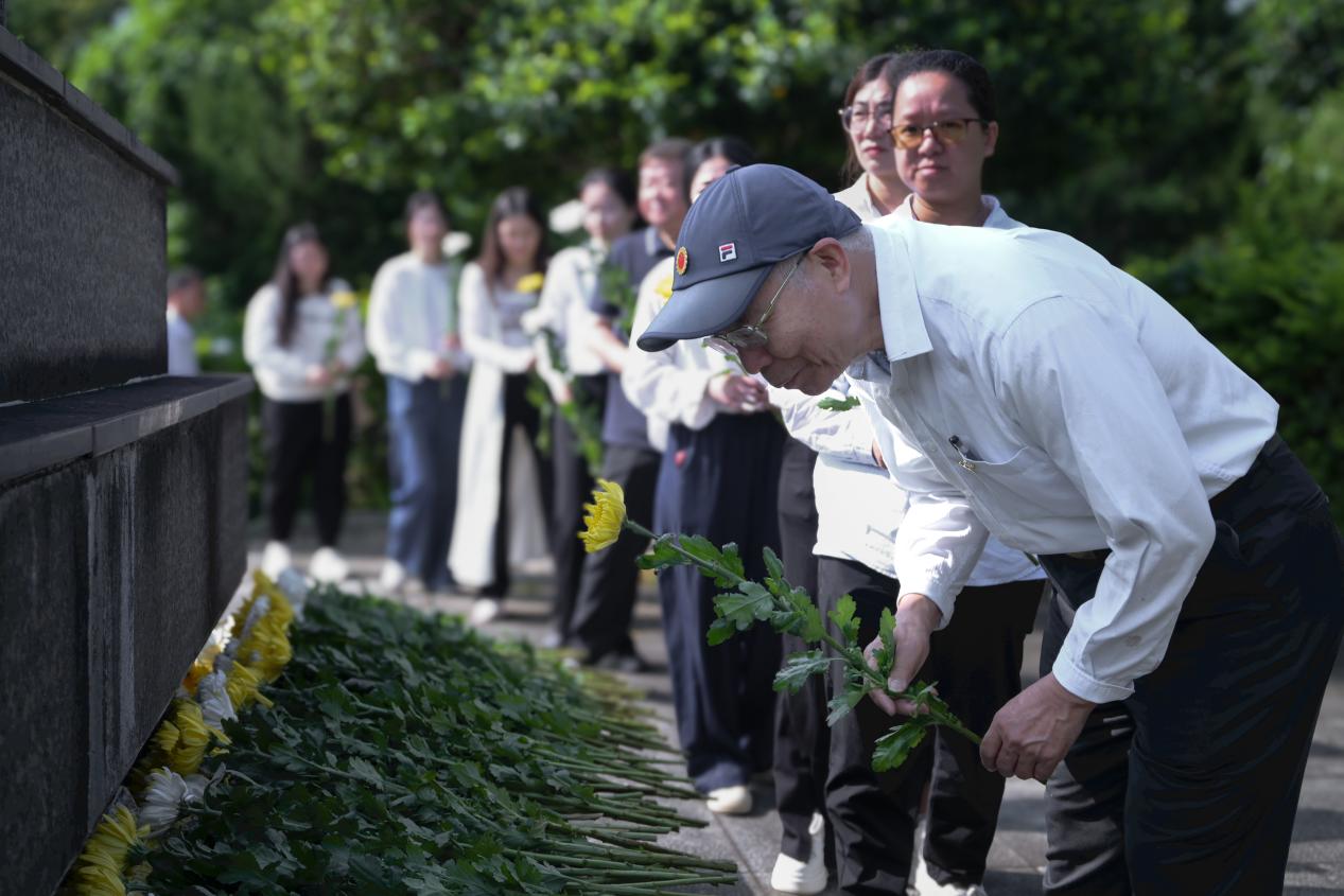現場,學校馬克思主義學院何楚婷老師以“銘記烽火歲月 傳承英雄精神”為主題,講述東江縱隊在大埔圍村的抗戰(zhàn)事跡,重溫革命先輩保家衛(wèi)國的崢嶸歲月。甘泉頌合唱團合唱《如愿》,全體人員繞行紀念碑一周,敬獻鮮花,寄托對先烈的哀思與敬意。
