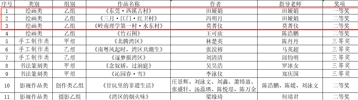 綜上所述,田婭娟老師作品《東莞·西溪古村》榮獲一等獎、莫菁儀老師作品《嶺南理學(xué)第一村·水東村》榮獲二等獎,田婭娟老師指導(dǎo)馮明月同學(xué)完成的作品《三月·江門·紅衛(wèi)村》榮獲二等獎,田婭娟、莫菁儀老師分別獲得優(yōu)秀指導(dǎo)教師獎。