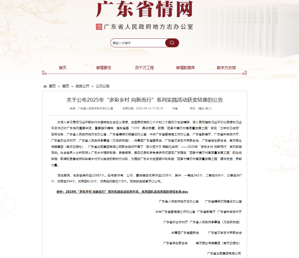 近日,由廣東省人民政府地方志辦公室等多部門聯(lián)合開展的2025年“多彩鄉(xiāng)村向新而行”系列實(shí)踐活動(dòng)獲獎(jiǎng)名單和2025年“多彩鄉(xiāng)村向新而行”系列實(shí)踐活動(dòng)立項(xiàng)課題名單正式公布。我校高度重視、精心組織,師生踴躍參與、深耕創(chuàng)作,最終新增1項(xiàng)省級立項(xiàng)課題、3項(xiàng)省級作品獎(jiǎng)+優(yōu)秀組織單位獎(jiǎng),充分展現(xiàn)了華立職院的育人實(shí)力與青春風(fēng)采!