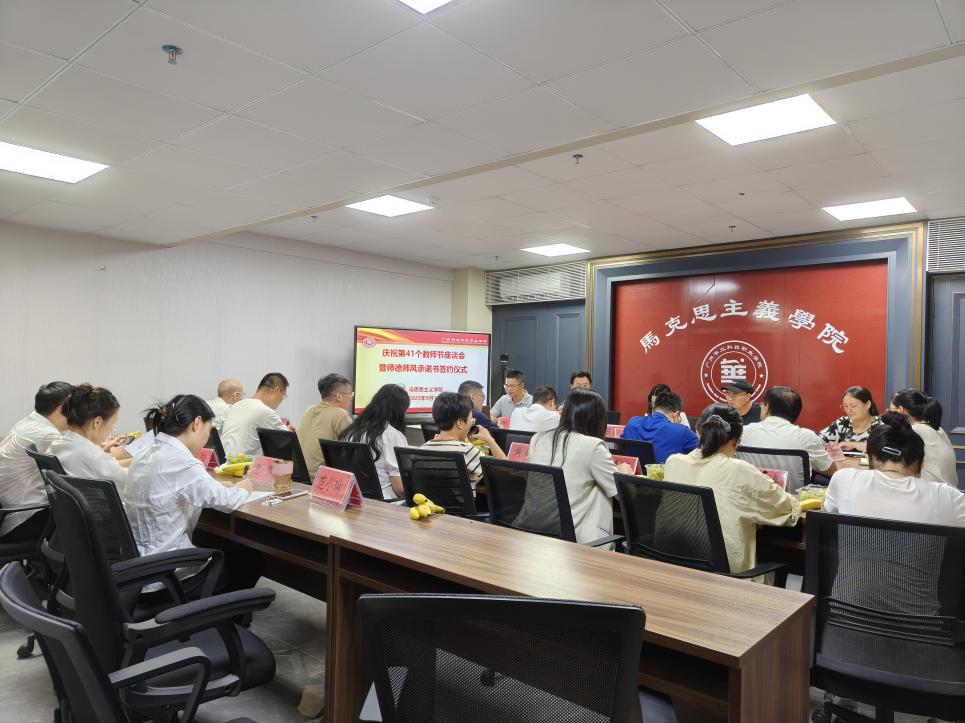 為學(xué)習(xí)弘揚(yáng)教育家精神,培育更優(yōu)良的師德師風(fēng),9月10日下午,馬克思主義學(xué)院在G1-314會(huì)議室舉行了慶祝第41個(gè)教師節(jié)座談會(huì)暨師德師風(fēng)承諾書簽訂儀式。