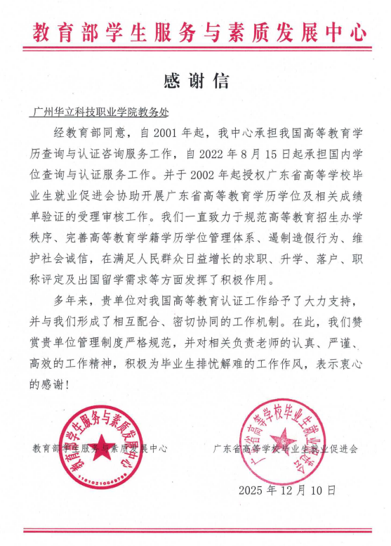 這份國家級權威機構的感謝信,是對學校工作的專業(yè)認可與育人成效的有力印證。未來,學校將繼續(xù)秉持嚴謹負責的工作態(tài)度,深化與教育部學生服務與素質(zhì)發(fā)展中心的協(xié)作,持續(xù)提升服務質(zhì)量與工作效能,為維護高等教育社會公信力、助力畢業(yè)生職業(yè)發(fā)展貢獻更多力量。