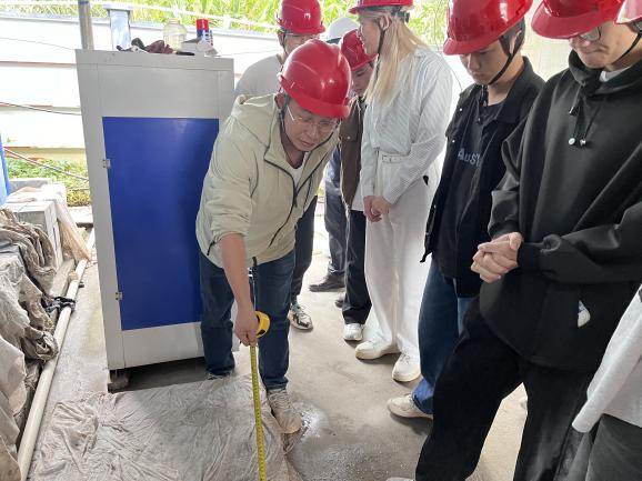在工地區(qū)域,項(xiàng)目技術(shù)負(fù)責(zé)人李進(jìn)鵬詳細(xì)講解模板流轉(zhuǎn)使用、塔吊布設(shè)注意事項(xiàng)、混凝土試塊養(yǎng)護(hù)設(shè)備操作規(guī)范等實(shí)踐知識(shí)。針對(duì)學(xué)生提出的銹蝕鋼筋處理、腳手架管件存放、塑料管材存儲(chǔ)要求等問(wèn)題,李工結(jié)合工程實(shí)例逐一解答,讓學(xué)生直觀感受建筑施工 “高效、環(huán)保、質(zhì)量可控”的優(yōu)勢(shì)。