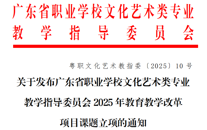 近日,廣東省職業(yè)學校文化藝術(shù)類專業(yè)教學指導委員會發(fā)布了《關(guān)于公布2025年教育教學改革項目立項名單的通知》(粵職文化藝術(shù)教指委0〔2025〕10號)。藝術(shù)與傳媒學院多項課題成功獲批立項,涵蓋數(shù)字藝術(shù)、人工智能應用、非遺傳承等多個前沿與熱點方向,彰顯了學院在文化藝術(shù)類專業(yè)教育教學改革方面的積極探索與雄厚實力。