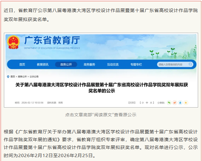 本屆賽事以“設(shè)計(jì)賦能·灣區(qū)共融”為主題,賽事旨在推進(jìn)大灣區(qū)建設(shè),深化粵港澳藝術(shù)教育交流,搭建三地師生深度互動(dòng)平臺(tái),增強(qiáng)青年學(xué)子的文化認(rèn)同感與社會(huì)責(zé)任感。本次獲獎(jiǎng)作品覆蓋面廣、精品度高,涵蓋工藝、環(huán)境設(shè)計(jì)、視覺(jué)傳達(dá)、數(shù)字媒體藝術(shù)、包裝設(shè)計(jì)等多個(gè)領(lǐng)域,全方位展現(xiàn)了學(xué)院師生多元的創(chuàng)作視野與扎實(shí)的專(zhuān)業(yè)功底。