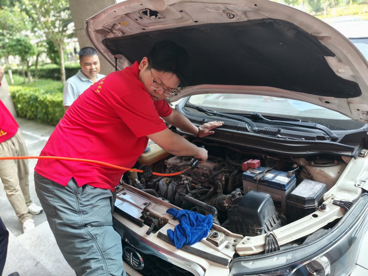 10月13日在科技樓下,在黨員陸建明老師的指導(dǎo)下,由汽車專業(yè)入黨積極分子為主力的汽車檢測(cè)服務(wù)小組,為師生的私家車進(jìn)行了免費(fèi)檢測(cè)與維護(hù)。