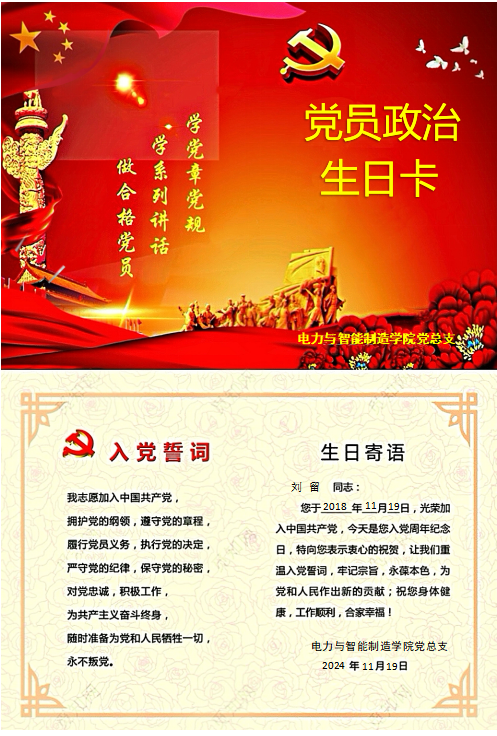 作為電力與智能制造學(xué)院的一名黨員教師劉留,在收到學(xué)院黨組織發(fā)來的“政治生日”賀卡,我的心情特別興奮,也感謝組織的關(guān)懷。11月19日,是我的政治生日,我認(rèn)為政治生日是表達(dá)對黨的忠誠和堅(jiān)定的重要時(shí)刻。在這個(gè)特殊的日子里,我回顧自己的入黨歷程,思考自己的初心和使命,這是一種對黨的忠誠和信仰的再次強(qiáng)化。