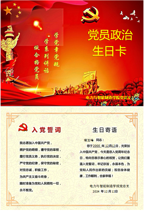 作為電力與智能制造學(xué)院的黨總支書記褚玉峰,12月12日早上我收到了學(xué)院黨組織發(fā)來的“政治生日”賀卡,心情特別興奮,24年前自己面對(duì)黨旗,舉起右手入黨宣誓的畫面立即浮現(xiàn)在了眼前,鏗鏘有力的誓言,使我今天干工作特別來勁。