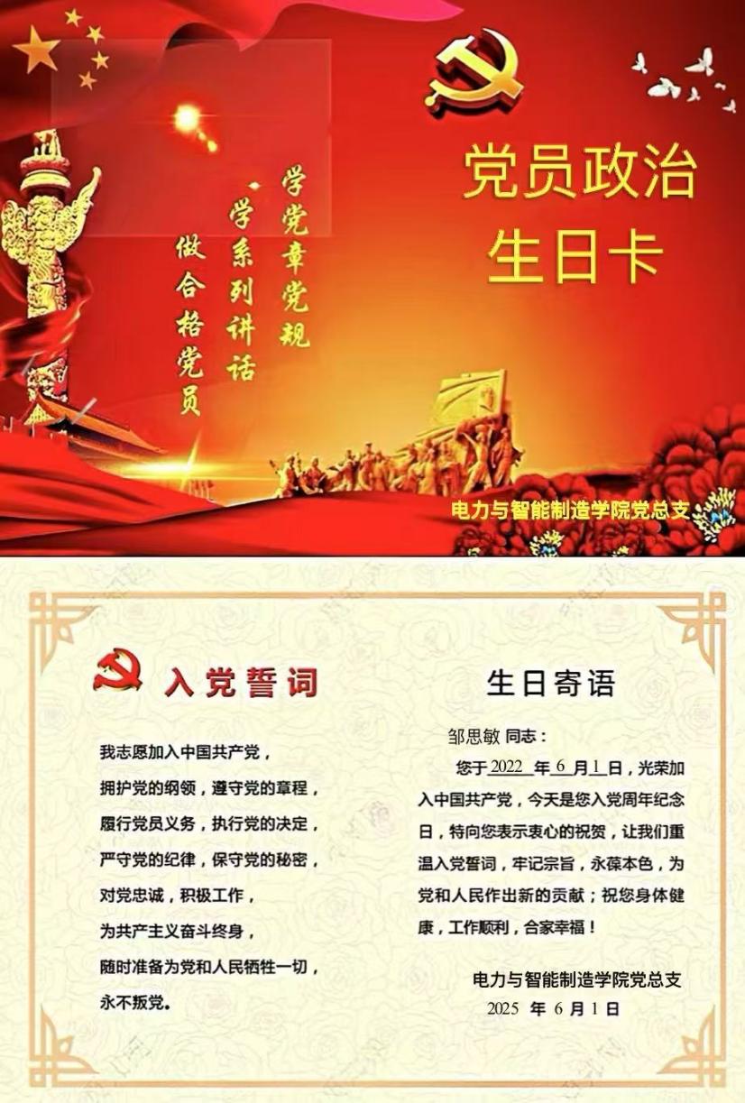 作為電力與智能制造學(xué)院黨總支教師黨支部的一名教師黨員鄒思敏,6月1日早上,收到了學(xué)院黨組織的發(fā)“政治生日”賀卡,心情特別興奮,2021年6月1日是我加入中國(guó)共產(chǎn)黨的日子。