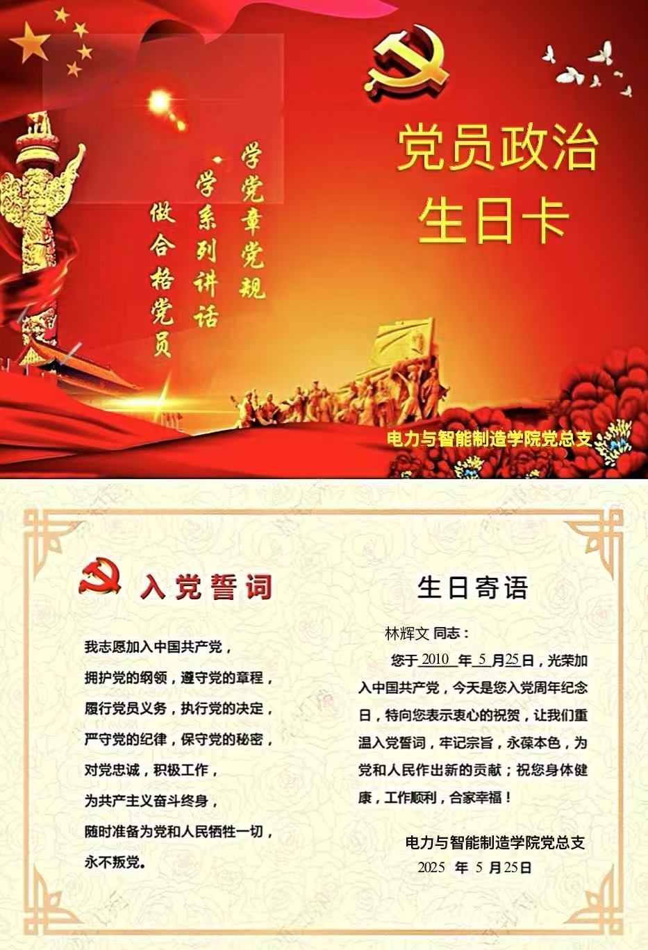 作為電力與智能制造學(xué)院的一名教師黨員林輝文,5月25日上午,收到了學(xué)院黨組織發(fā)的“政治生日”賀卡,心情特別興奮,2010年5月25日是我加入中國共產(chǎn)黨的日子。