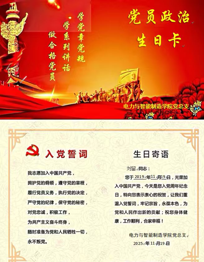 作為電力與智能制造學(xué)院的一名黨員教師劉留,1119日,在收到學(xué)院黨組織發(fā)來的“政治生日”賀卡,我的心情特別興奮,政治生日是表達自己對黨的忠誠和堅定信仰的重要時刻在這個特殊的日子里,對黨的忠誠信仰得到了再次強化