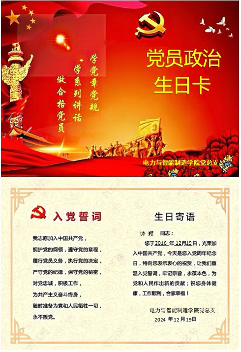 本人鐘穎,作為電力與智能制造學(xué)院的一名黨員教師,12月19日,在收到學(xué)院黨組織發(fā)來的“政治生日”賀卡,我的心情特別興奮,同時(shí)也感謝組織的關(guān)懷,我認(rèn)為政治生日是表達(dá)對(duì)黨的忠誠和堅(jiān)定的重要時(shí)刻。