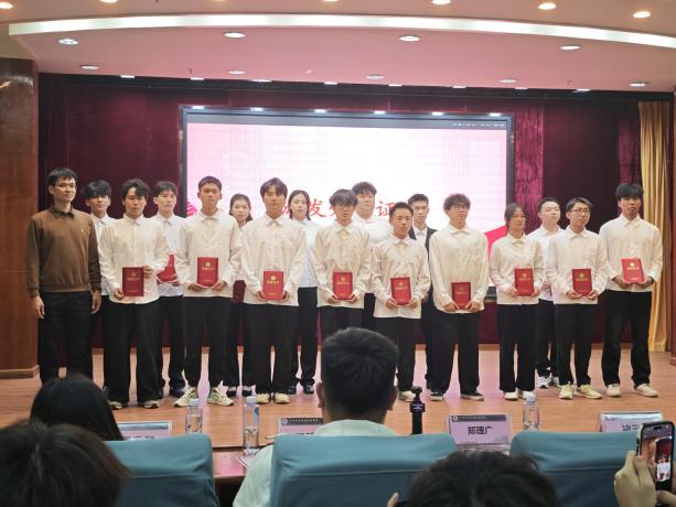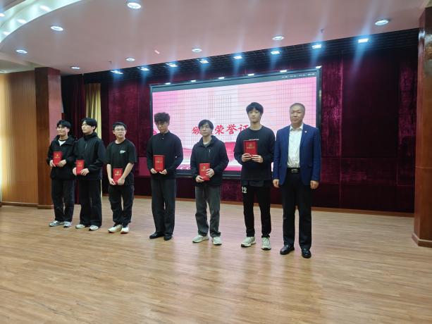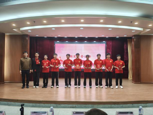 (學(xué)院黨委書記褚玉峰、黨總支專職副書記鄭理廣、學(xué)生黨建工坊指導(dǎo)老師王凱為獲獎隊伍頒獎)
